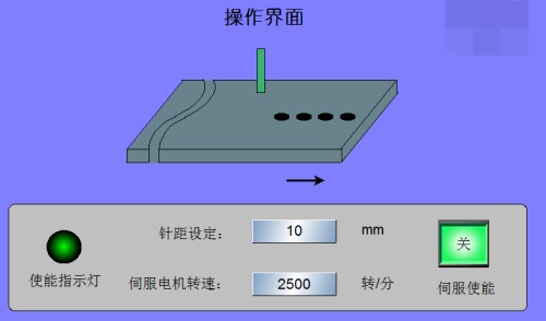 HMI主界面如圖7所示,可進(jìn)行伺服使能控制以及針距及伺服速度的設(shè)定,顯示設(shè)備的當(dāng)前工作狀態(tài)和報(bào)警狀態(tài)等信息。