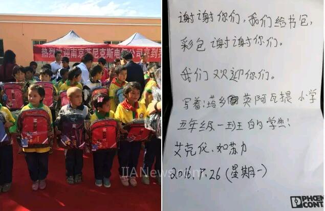 3、為希望小學(xué)五十名特困學(xué)生帶去了書包和學(xué)習(xí)用具(孩子用不熟練的漢語表達(dá)對遠(yuǎn)方客人感謝,這正如學(xué)校校長所言:漢語師資匱乏,孩子們的漢語水平有待提高);