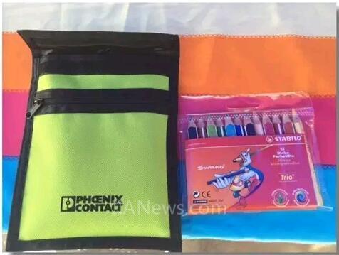 4、集團(tuán)公司的Mr. Klaus Hengsbach給每個孩子送去帶有公司LOGO的小小便簽包(內(nèi)含便簽本和彩筆一套),以及送給每一位老師的筆。