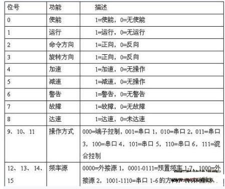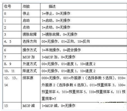 1)變頻器啟動(dòng)/停止/報(bào)警復(fù)位語(yǔ)句,使用輸出控制第一個(gè)字,PLC→HARSVERT-A變頻器,具體含義如下: