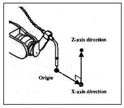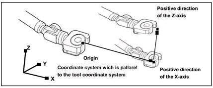 六點(diǎn)(XZ)示教法中,取一個(gè)方向原點(diǎn)、一個(gè)與所需工具坐標(biāo)系平行的X軸方向點(diǎn)、一個(gè)XZ平面上的點(diǎn)。此時(shí),通過笛卡爾點(diǎn)動(dòng)或工具點(diǎn)動(dòng)進(jìn)行示教,以使工具的傾斜保持不變。