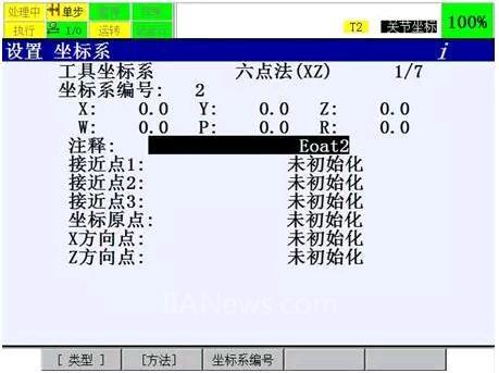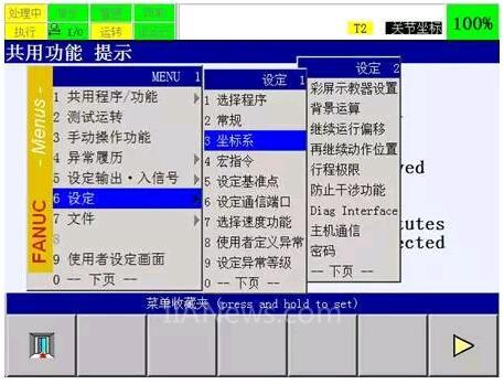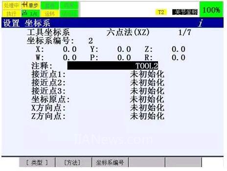 2.選擇“ 設(shè)定 ”,光標(biāo)右移選擇 “ 坐標(biāo)系 ”。出現(xiàn)工具坐標(biāo)系一覽畫面。