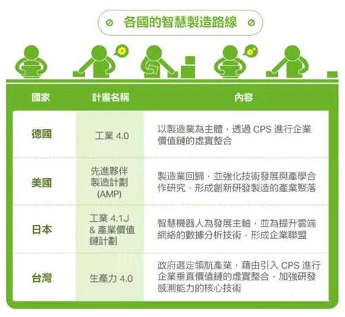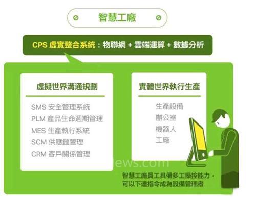 臺(tái)灣政府選定制造業(yè)、農(nóng)業(yè)、零售業(yè)等幾項(xiàng)領(lǐng)航產(chǎn)業(yè),透過CPS系統(tǒng)的研發(fā)與引進(jìn),希望藉由先深化選定企業(yè)的垂直智慧價(jià)值鏈,在工業(yè)制程、企業(yè)管理上進(jìn)行整合,并逐步向水平價(jià)值鏈拓展。方法則是針對感測器、關(guān)鍵零組件等核心技術(shù)加強(qiáng)研發(fā)能力,并冀此運(yùn)用於各項(xiàng)產(chǎn)業(yè)上、提升生產(chǎn)效能。