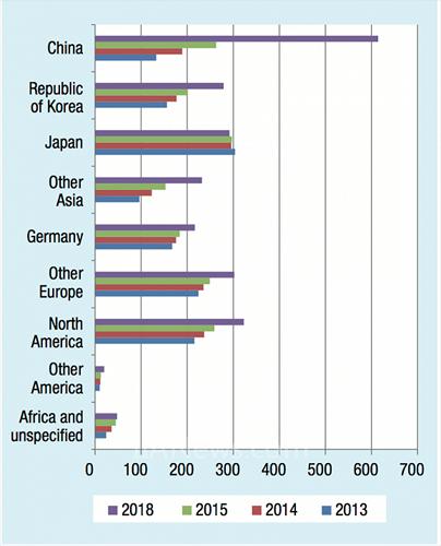 2013-2018年部分地區(qū)的使用的工業(yè)機器人數(shù)量 單位:千