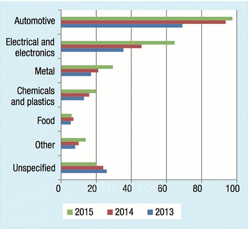 2013-2015年全球工業(yè)機器人主要供應(yīng)的行業(yè)。