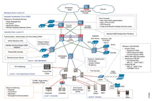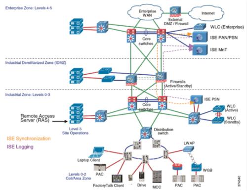 CPWE是底層架構(gòu),為控制和信息部門、設(shè)備和裝置中的現(xiàn)代IACS應(yīng)用提供標(biāo)準(zhǔn)的網(wǎng)絡(luò)服務(wù)。思科的ISE與CPWE架構(gòu)一起提供用于網(wǎng)絡(luò)訪問控制安全的一個(gè)附加動態(tài)層,通過識別基于微軟的計(jì)算機(jī)、操作系統(tǒng)和登錄的用戶,對訪問網(wǎng)絡(luò)基礎(chǔ)設(shè)施的計(jì)算機(jī)實(shí)施安全策略。該CPWE架構(gòu)提供設(shè)計(jì)和實(shí)施指南,以實(shí)現(xiàn)IACS的實(shí)時(shí)通信、可靠性、可擴(kuò)展性,安全性和靈活性要求。思科ISE建立在定義的最佳實(shí)踐之上,網(wǎng)絡(luò)架構(gòu)具有集中管理的架構(gòu)模型,這里IT部門負(fù)責(zé)維護(hù)思科的ISE平臺,運(yùn)行在工業(yè)區(qū)內(nèi)。