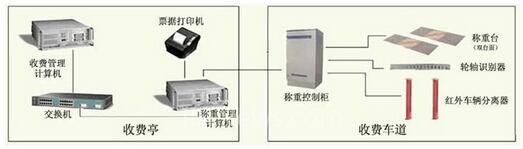 高速公路車輛計重收費系統(tǒng)由動態(tài)衡器,車輛分離器,輪軸識別器、稱重控制器、稱重管理計算機(jī)系統(tǒng)等構(gòu)成(見下圖)