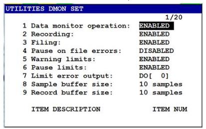 每個(gè)Data Monitor Schedule能同時(shí)監(jiān)控6個(gè)參數(shù),監(jiān)控參數(shù)數(shù)量可在第10行設(shè)置。還可以設(shè)置采用頻率、監(jiān)控頻率以及記錄頻率??梢栽O(shè)置監(jiān)控參數(shù)的范圍,當(dāng)監(jiān)控參數(shù)進(jìn)入此范圍時(shí),機(jī)器人可以提出警示信息或暫停。