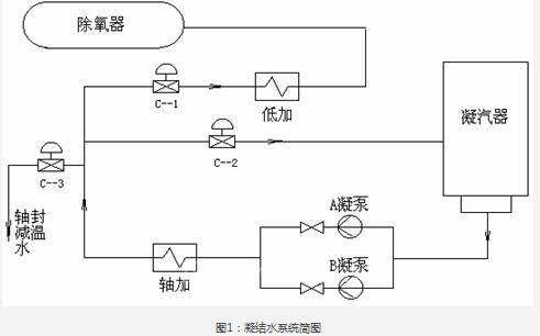 凝結(jié)水泵采用定速運(yùn)行,凝結(jié)水經(jīng)凝泵升壓后流經(jīng)軸加,通過主凝結(jié)水調(diào)節(jié)閥(即除氧器上水調(diào)整門,系統(tǒng)編號為C-1)和低加進(jìn)入除氧器。調(diào)整主凝結(jié)水調(diào)節(jié)閥開度來調(diào)節(jié)凝結(jié)水量,維持除氧器水位穩(wěn)定滿足機(jī)組運(yùn)行需要。另外凝結(jié)水還供給汽輪機(jī)低壓軸封汽減溫水用水,以及低壓旁路減溫、汽機(jī)低壓缸噴水減溫等用水。為防止機(jī)組低負(fù)荷運(yùn)行時(shí)凝結(jié)水系統(tǒng)超壓和凝結(jié)水泵汽蝕,還設(shè)計(jì)有凝結(jié)水再循環(huán)管路,再循環(huán)調(diào)節(jié)閥C-2配合C-1調(diào)整除氧器水位,維持系統(tǒng)運(yùn)行正常壓力。凝結(jié)水系統(tǒng)如圖1所示。