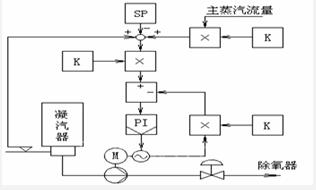 為改善除氧器水位、凝器器水位自動(dòng)調(diào)節(jié)系統(tǒng)的調(diào)節(jié)品質(zhì),提高控制水平,在本次變頻裝置改造自動(dòng)控制方案中使用目前該領(lǐng)域針對除氧器水位控制最新研究成果——間斷式控制理論,引入了一些先進(jìn)的控制思想(靜態(tài)不完全預(yù)估),主要思想是將變頻凝結(jié)水泵的轉(zhuǎn)速信號引入控制系統(tǒng)中,與水位偏差相平衡,保證水位的相對穩(wěn)定(控制在一定的區(qū)間內(nèi)),并引入機(jī)組的主蒸汽流量信號,以提高系統(tǒng)的負(fù)荷適應(yīng)能力和補(bǔ)償變頻凝結(jié)水泵轉(zhuǎn)速信號引起的偏差,使系統(tǒng)只是在機(jī)組負(fù)荷發(fā)生變化的過程中和水位自發(fā)擾動(dòng)變化的過程中動(dòng)作,變頻凝結(jié)水泵的轉(zhuǎn)速信號與上述擾動(dòng)變化量相平衡后,系統(tǒng)處于等待狀態(tài)。以適應(yīng)熱力系統(tǒng)的滯后和各種不確定因素,組態(tài)框圖如下圖。