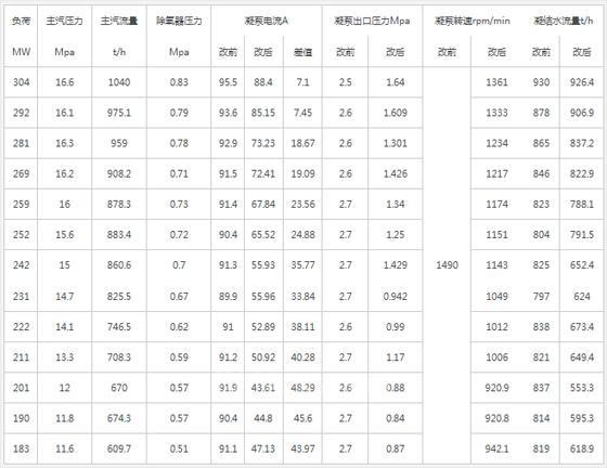 改造前、后在不同工況下凝結(jié)水泵及電動(dòng)機(jī)的運(yùn)行參數(shù):