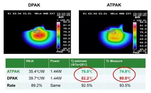 安森美半導(dǎo)體進(jìn)行了基準(zhǔn)測(cè)試,以比較DPAK封裝與新的ATPAK封裝的熱性能。結(jié)果表明,ATPAK所用的新的夾焊技術(shù)帶來(lái)改善的熱性能。此外,ATPAK散熱能力優(yōu)于DPAK-盡管少35%的體積-導(dǎo)致結(jié)溫降低6.2℃,從而提供更高可靠性。