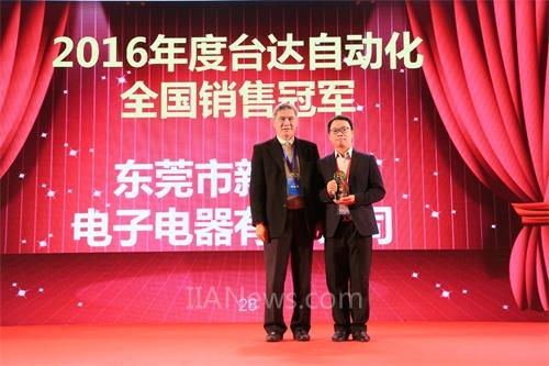 臺(tái)達(dá)董事長(zhǎng)海英俊先生為獲得“2016年度臺(tái)達(dá)自動(dòng)化全國(guó)銷售冠軍”的渠道商伙伴頒獎(jiǎng)