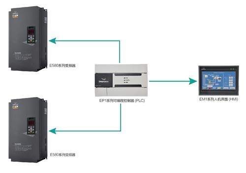 系統(tǒng)配置:兩臺(tái)E580變頻器+PLC+觸摸屏