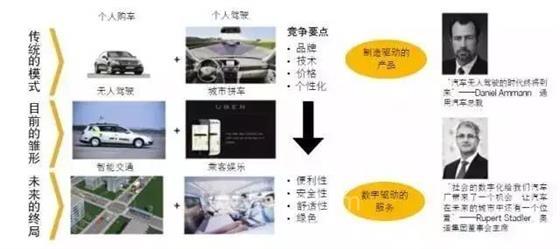 而今天,在以谷歌為代表的無(wú)人駕駛技術(shù)和以?xún)?yōu)步為代表的城市大眾拼車(chē)的潮流的影響下,運(yùn)營(yíng)的核心轉(zhuǎn)向了數(shù)據(jù)而非產(chǎn)品,包括車(chē)輛數(shù)據(jù)、道路數(shù)據(jù)、環(huán)境數(shù)據(jù)和個(gè)人出行需求。一種 “數(shù)字驅(qū)動(dòng)的服務(wù)”的雛形正在逐漸形成。未來(lái)隨著智能交通技術(shù)的出現(xiàn)和普及,人們期望的是隨叫隨停的出行方式,追求便利、安全、舒適和綠色,而汽車(chē)廠商則會(huì)向社會(huì)交通工具運(yùn)營(yíng)商的方向發(fā)展。這時(shí),汽車(chē)品牌、技術(shù)等現(xiàn)在的競(jìng)爭(zhēng)要點(diǎn)會(huì)變得弱化,這對(duì)以豪華品牌和“高技術(shù)+高品牌—>產(chǎn)品溢價(jià)”的德國(guó)汽車(chē)工業(yè)來(lái)說(shuō),將會(huì)面臨巨大的挑戰(zhàn)。汽車(chē)業(yè)如此,其他制造業(yè)也面臨著類(lèi)似的挑戰(zhàn)。