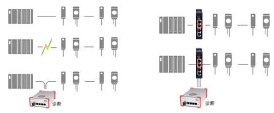 由于使用了成熟的以太網(wǎng)技術(shù),工業(yè)網(wǎng)絡(luò)抗干擾的能力已非常強(qiáng)大。然而,在有擾動(dòng)的情況下,基于以太網(wǎng)的工業(yè)網(wǎng)絡(luò)也需要能夠快速并且簡單易用地進(jìn)行故障檢測?;谝蕴W(wǎng)的系統(tǒng)是以菊花鏈的拓?fù)浣Y(jié)構(gòu)連接的,因此診斷設(shè)備無法做到在網(wǎng)絡(luò)中的任意一點(diǎn)都能連接,同時(shí)也無法在每個(gè)網(wǎng)絡(luò)節(jié)點(diǎn)上都能檢測到整個(gè)報(bào)文數(shù)據(jù)流。因此,網(wǎng)絡(luò)訪問通常直接在控制器的后面完成。為了連接一個(gè)診斷設(shè)備,以太網(wǎng)的點(diǎn)對點(diǎn)連接必須暫時(shí)斷開,這導(dǎo)致了控制器與設(shè)備通訊的中斷,從而會(huì)導(dǎo)致工廠的停機(jī)。為了消除中斷網(wǎng)絡(luò)的弊端,netMIRROR的測試訪問點(diǎn)(TAP)允許持續(xù)的以太網(wǎng)報(bào)文的鏡像,而不會(huì)影響網(wǎng)絡(luò)本身。TAP一般永久性地直接安裝在控制器的以太網(wǎng)連接出口,從而在運(yùn)行時(shí)能夠無中斷地接入診斷設(shè)備。另外,TAP保證了連接的診斷設(shè)備或者用于報(bào)文抓取的PC不會(huì)由于意外插入的以太網(wǎng)報(bào)文而干擾網(wǎng)絡(luò)。相比集成主動(dòng)鏡像口的交換機(jī),TAP保證了網(wǎng)絡(luò)數(shù)據(jù)流的計(jì)時(shí),在網(wǎng)絡(luò)負(fù)載高負(fù)荷或者報(bào)文錯(cuò)誤時(shí)不會(huì)有報(bào)文被遺漏。