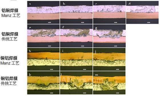 · 加強(qiáng)焊接強(qiáng)度及耐久性:一般將鋁和銅混合在一起后,會(huì)導(dǎo)致出現(xiàn)脆性金屬間相,這將對于機(jī)械強(qiáng)度和耐熱沖擊性產(chǎn)生不良影響。為徹底理解這兩種特性如何影響鋁銅和銅鋁焊縫,Manz開發(fā)組采用光學(xué)顯微鏡和能量彌散X射線譜(EDX)拍攝了焊縫的顯微照片進(jìn)行了評估。實(shí)驗(yàn)證明,采用Manz新型焊接工藝的焊縫,具有耐熱沖擊性,這使得終端商品在使用上具備更好的耐久性。