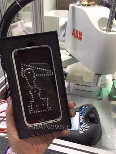 SCARA從夾具上取水鉆,沾取無影膠,點放在手機(jī)保護(hù)殼上。