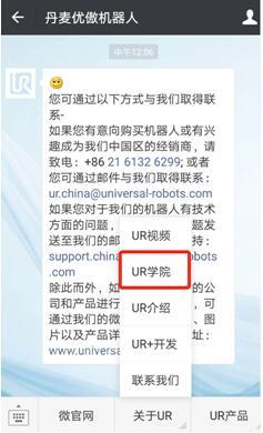 用戶可以進入優(yōu)傲機器人公眾微信號 (universalrobots) ,在首頁菜單“關(guān)于UR”內(nèi)選擇“UR學院”子菜單,或訪問 、點擊“歡迎進入優(yōu)傲學院”,進入在線上培訓平臺。