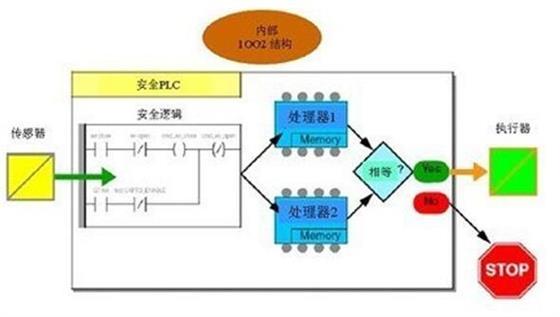 安全PLC內(nèi)部CPU數(shù)量至少兩個(gè)或者多個(gè),兩個(gè)CPU的功能是:分別對(duì)同一個(gè)程序各執(zhí)行一次,然后把記過放在一起比較,如果結(jié)果一直,就會(huì)進(jìn)行輸出,如果不一致,則選擇安全的結(jié)果輸出(通常意義上的不輸出或者停機(jī))