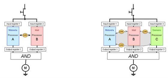 安全PLC通常都有兩個(gè)處理器,通常處理器是由兩個(gè)不同廠家進(jìn)行的提供,比如一個(gè)摩托羅拉,一個(gè)因特爾,同時(shí)進(jìn)行解碼和執(zhí)行。這種差異性提供了失效檢測(cè)的下列優(yōu)點(diǎn):