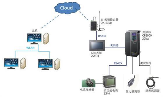 在系統(tǒng)控制上,臺(tái)達(dá)空壓機(jī)工業(yè)物聯(lián)網(wǎng)解決方案采用內(nèi)建PLC功能的風(fēng)機(jī)水泵專(zhuān)用矢量控制變頻器CP2000系列搭配溫度和壓力傳感器控制空壓機(jī)運(yùn)行,以及多功能電表DPM系列和電流互感器監(jiān)測(cè)電流信息。這些數(shù)據(jù)信息通過(guò)3G云端路由器上傳至云端。最后由DIAView從云端讀取信息,實(shí)時(shí)顯示于畫(huà)面上供管理者查閱。管理者可依據(jù)DIAView所擷取到的信息,調(diào)整空壓機(jī)運(yùn)行狀態(tài)。