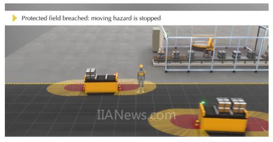 涉及人與機器之間交互的應用非常需要安全解決方案。安全激光掃描儀可檢測是否有人接近危險運動并關閉該運動。保護區(qū)和警告區(qū)可以靈活配置,并適應環(huán)境條件。當有人進入警告區(qū)域時,危險運動由受控制動控制。如果有人進入保護區(qū)域,則停止危險運動。