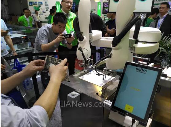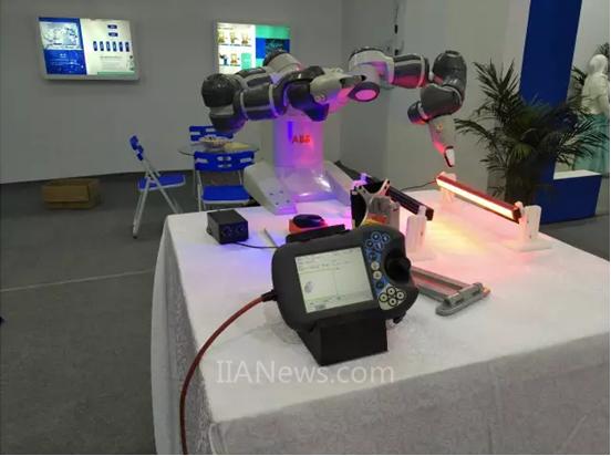 這次ABB的協(xié)作機器人“YuMi”是其在中國的合作伙伴林積為公司帶來的。該機器人擁有軟墊包裹的機械臂、力傳感器和嵌入式安全系統(tǒng),與人類同事相碰撞時,可在幾毫秒內暫停運動,并很快再次恢復運動。由于其尺寸小,可以將它安裝在普通的工作臺上。同時與ABB的集成視覺高度兼容。
