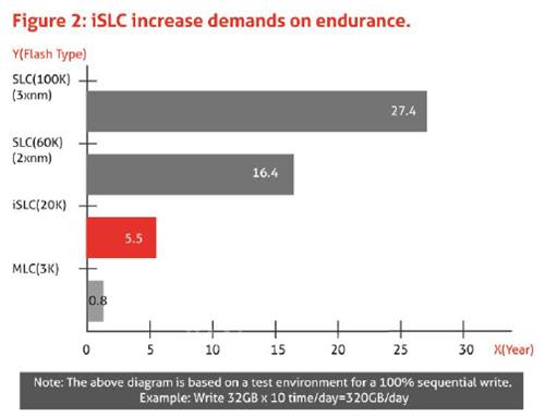 測試顯示,在一塊搭載iSLC NAND 閃存的32GB的SSD上做寫入操作,按照每天寫入320GB來計算,使用壽命超過5.5年,而換成MLC產(chǎn)品則堅持不到1年,顯然iSLC NAND非常適合于工業(yè)應(yīng)用。