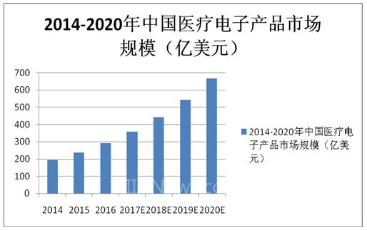 2014年中國醫(yī)療電子產(chǎn)品總市場規(guī)模達(dá)到157.4億美元, 2015年及2016年分別達(dá)到237億美元和291億美元,預(yù)計(jì)到2020年市場規(guī)模將達(dá)到666億美元。