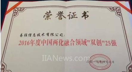 同時(shí),易往信息還收獲2016年度“中國(guó)兩化融合領(lǐng)域‘雙創(chuàng)’25強(qiáng)”大獎(jiǎng)。
