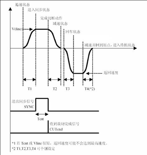 C.同步狀態(tài):一旦進入同步狀態(tài),驅(qū)動器立刻送出同步信號給外圍負責剪切或者鋸的機構(gòu),要求執(zhí)行切斷動作。同時伺服依然持續(xù)偵測進料長度以及速度,隨時保持鋸臺與材料之間的動態(tài)相對位置永遠不變,如此才能確保裁切斷面的平整,當裁切完成之后,裁切裝置退出并發(fā)出裁切完成信號,伺服收到此信號后則不再持續(xù)維持同步,立刻進入減速狀態(tài)。