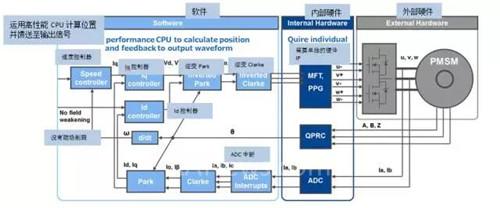 內(nèi)部硬件中的多功能計(jì)時(shí)器 (MFT) 不但可以為每一個(gè)輸出信號 (u、v、w) 及其互補(bǔ)信號 (u-、v-、w-) 產(chǎn)生基本 PWM 脈沖,包括死區(qū)時(shí)間。這些信號是用于驅(qū)動輸出橋的高低側(cè)開關(guān)。在這個(gè)示例中,采用內(nèi)部正交位置和分辨率計(jì)數(shù)器(QPRC) 外設(shè)以獲取轉(zhuǎn)子位置信息。磁場定向控制(FOC) 算法執(zhí)行所需的轉(zhuǎn)子信息可通過工業(yè)環(huán)境中 PMSM 電機(jī)上安裝的光學(xué)或磁性編碼器獲取,如伺服驅(qū)動器。在家用電器或其他應(yīng)用中,該模塊通常使用“無傳感”控制方法實(shí)行。無傳感控制通過電機(jī)數(shù)學(xué)模型計(jì)算轉(zhuǎn)子距離已測量電機(jī)電流的位置,而不是測量轉(zhuǎn)子的位置。