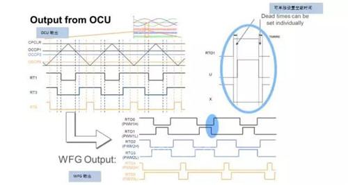 僅需幾個(gè)步驟,多功能計(jì)時(shí)器就可以產(chǎn)生一個(gè) PWM波形。自由運(yùn)行計(jì)時(shí)器可以為 PWM 信號提供時(shí)間基準(zhǔn),并確定 PWN 的分辨率和頻率。輸出比較單元 (OCU) 能為每個(gè)輸出相位確定占空比信號 RT1、3、5(注意:圖3顯示的示例配置僅使用3 個(gè)輸出比較單元。)信號發(fā)生器發(fā)出相應(yīng)的互補(bǔ)信號 RTO0-RTO5,包括從 RT 信號自動插入死區(qū)時(shí)間,現(xiàn)在可以控制 FET 此類功率管或 IGBT 功率管。信號發(fā)生器也可以處理此類問題,如故障引起的過流。PWM 則可以立即關(guān)機(jī)。這不需要軟件參與,也不要啟動故障安全運(yùn)行。