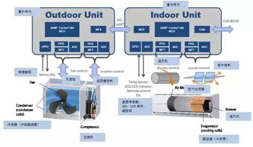室內(nèi)單元需要控制一個(gè)或多個(gè)風(fēng)扇/吹風(fēng)機(jī),也可以運(yùn)用磁場定向控制算法,保證運(yùn)行高效而安靜。另有幾個(gè)感應(yīng)器用于測量室溫、濕度及其他參數(shù)。除了連接室外單元,室內(nèi)單元還要與空調(diào)整合到建筑物管理系統(tǒng) (BEMS),統(tǒng)籌供熱通風(fēng)與空氣調(diào)節(jié)(Heating,Ventilation, Air Conditioning,HVAC)。此過程通過 CAN 接口可完成。