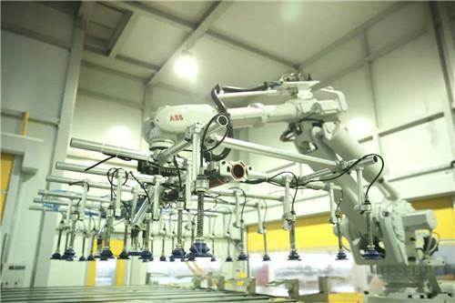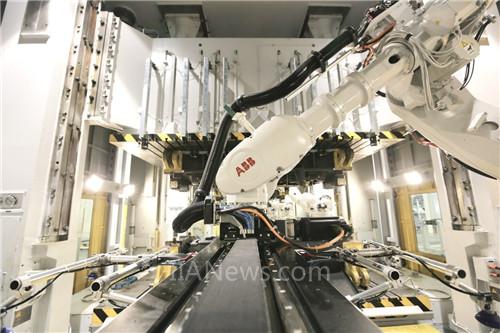 柳州柳新汽車沖壓件有限公司PV2大型沖壓生產(chǎn)線上共使用6臺ABB機(jī)器人,包括3臺IRB 6660六軸機(jī)器人,分別用于拆垛,線首上料和線尾下料,和3臺直線7軸機(jī)器人IRB 7600FX,進(jìn)行壓機(jī)間零件傳輸。整線配置了降噪封閉,以降低生產(chǎn)噪音。