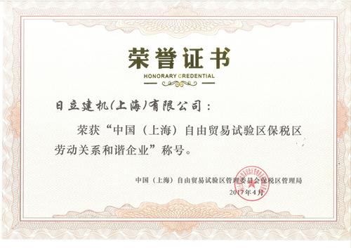 日立建機(jī)(上海)有限公司榮獲“中國(上海)自由貿(mào)易試驗(yàn)區(qū)保稅區(qū)勞動關(guān)系和諧企業(yè)”稱號