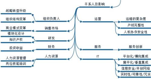 上圖以傳統(tǒng)型制造企業(yè)為例,組織結(jié)構(gòu)一般包含組織負(fù)責(zé)人、市場(chǎng)銷售、運(yùn)營(yíng)、研發(fā)、財(cái)務(wù)、服務(wù)、人力資源、IT等。下文中試圖分析傳統(tǒng)型組織在向工業(yè)4.0組織轉(zhuǎn)型過程中可能對(duì)干系人造成的影響,以利于組織考慮相應(yīng)的應(yīng)對(duì)措施。