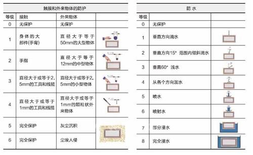 IEC是世界領(lǐng)先的為所有電氣、電子和相關(guān)技術(shù)(統(tǒng)稱為“電工”)編制和發(fā)布國際標(biāo)準的機構(gòu)。IEC 60529標(biāo)準包含兩位數(shù)字代碼,成為特征數(shù)字,因為關(guān)系入口防護(Ingress Protection),俗稱為“IP等級”。第一位數(shù)字表示對外來物體的防護,第二位數(shù)字表示對水的防護。