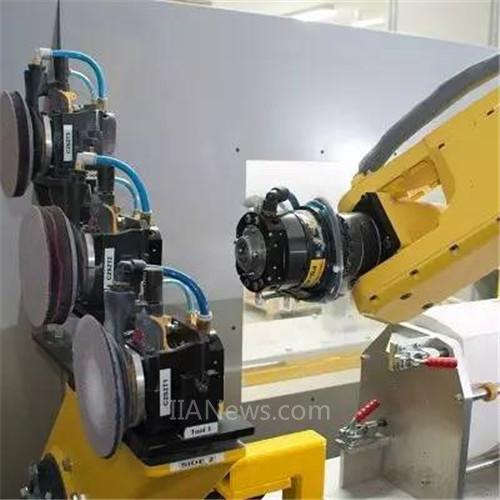 機(jī)器人手抓采用了自動(dòng)更換手抓設(shè)計(jì),可根據(jù)需要,自動(dòng)更換不同的打磨工具。在B&W,每套打磨系統(tǒng)的兩邊各設(shè)置了三套打磨工具。另外,機(jī)器人還可自動(dòng)對(duì)舊砂盤進(jìn)行剝離和新砂盤的更換,這也提升了系統(tǒng)的自動(dòng)化程度和效率。