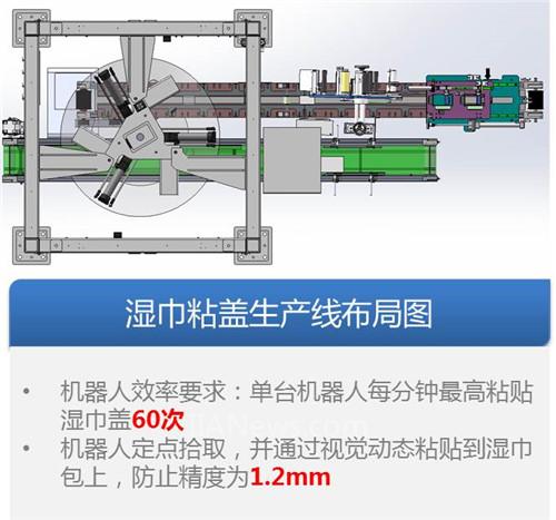 傳統(tǒng)濕巾生產(chǎn)流程中難點之一——濕巾蓋與濕巾包的粘貼工作這回完全由“長了眼睛”的并聯(lián)機器人完成,機器人定點抓取經(jīng)過自動出料和自動貼標(biāo)的濕巾蓋,噴膠一周后,通過視覺系統(tǒng)和標(biāo)準(zhǔn)皮帶線上的編碼器,動態(tài)粘貼至來料線的濕巾包上,整個流程一氣呵成。該生產(chǎn)工藝有效的提高生產(chǎn)效率和產(chǎn)品的合格率、降低了企業(yè)生產(chǎn)成本。