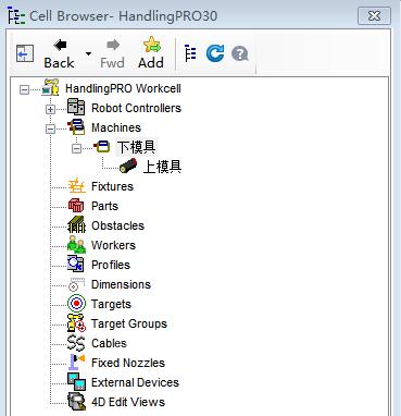 在ROBOGUIDE中導(dǎo)入外部的實(shí)體數(shù)模,可以添加在Machines、Fixtures、Parts、Obstacles等不同目錄中,如下圖所示。需要注意的是,在創(chuàng)建壓機(jī)的過(guò)程中,壓機(jī)應(yīng)添加在Machines欄中,因?yàn)橹挥性趍achine上可以再添加Link,而且添加在machine上的link在設(shè)置之后是可以在程序運(yùn)行時(shí)一起運(yùn)動(dòng)的。利用這一特性我們可以實(shí)現(xiàn)壓機(jī)下模具與上模具之間的相對(duì)運(yùn)動(dòng)。類似的如滑臺(tái)、轉(zhuǎn)臺(tái)、導(dǎo)軌等有多工位或者需要運(yùn)動(dòng)的設(shè)備都須添加在這個(gè)目錄中。