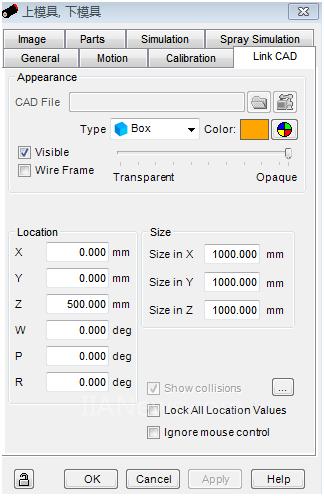 在將數(shù)模導(dǎo)入ROBOGUIDE前,需要使用3D制圖軟件將壓機(jī)數(shù)模拆分為上模具和下模具(包括壓機(jī)本體)兩部分并使用ROBOGUIDE將數(shù)模轉(zhuǎn)換為IGS格式。準(zhǔn)備完成后,打開ROBOGUIDE,右鍵點(diǎn)擊目錄樹上的Obstacles,將鼠標(biāo)移動(dòng)至Add Obstacle上就會(huì)彈出右側(cè)添加obstacle的選項(xiàng),點(diǎn)擊CAD File,選擇壓機(jī)下模具數(shù)模。然后右擊目錄樹上新生成的machine并Add Link,選擇壓機(jī)上模具的數(shù)模。拖動(dòng)上模具數(shù)模調(diào)整與下模具的相對(duì)位置或在Link CAD選項(xiàng)卡中Location處輸入準(zhǔn)確相對(duì)位置。至此壓機(jī)創(chuàng)建完成。在項(xiàng)目樹中選中下模具后,可移動(dòng)整個(gè)壓機(jī)的位置。