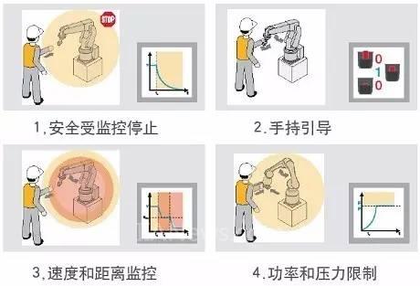 第4種,功率和壓力限制,這是目前最創(chuàng)新的方式。在這種類型中,通過技術(shù)手段將工人和機器人之間的接觸力限制在無害水平。因此功率和壓力限制日益成為人機協(xié)作安全實施的重要趨勢。但是采用上述前三種協(xié)作類型的傳統(tǒng)工業(yè)機器人還會繼續(xù)存在。