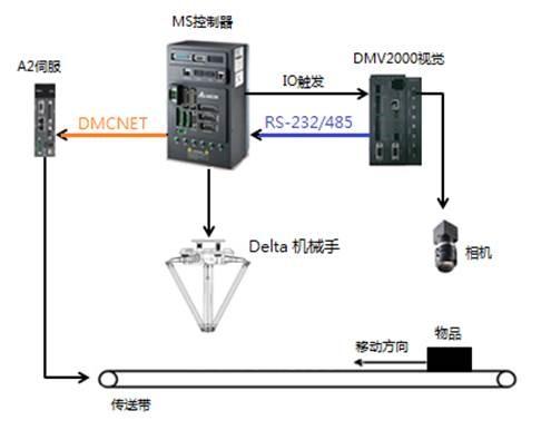 客戶針對(duì)解決方案的要求包括:必須能夠?qū)崿F(xiàn)傳送帶高速運(yùn)行、機(jī)械手抓取快速、裝箱位置及角度準(zhǔn)確,并能夠自動(dòng)計(jì)算裝箱高度和層數(shù)。同時(shí)也要求系統(tǒng)具有可擴(kuò)展性,便于與產(chǎn)線其他設(shè)備進(jìn)行數(shù)據(jù)交換和融于整體監(jiān)控系統(tǒng)。臺(tái)達(dá)根據(jù)客戶要求和Delta高速分揀機(jī)器人的作業(yè)流程,整合自有手持示教器、機(jī)器人控制驅(qū)動(dòng)一體機(jī)ASDA-MS系列、多鏡頭機(jī)器視覺系統(tǒng)DMV2000系列、伺服驅(qū)動(dòng)器和馬達(dá)等工業(yè)自動(dòng)化產(chǎn)品,建構(gòu)包括機(jī)械手臂、機(jī)器視覺系統(tǒng)和輸送帶等在內(nèi)的完整控制系統(tǒng)解決方案。
