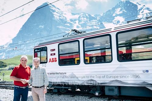 少女峰鐵路首席執(zhí)行官Urs Kessler和ABB瑞士總裁Remo Lutolf站在ABB全新品牌涂裝的列車前