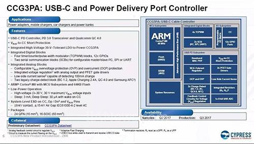 在USB-C的連接線中,不僅要增加數(shù)據(jù)傳輸?shù)臄?shù)率,同時(shí)還要將電源傳輸也要同步加大,賽普拉斯最新推出的USB-C控制器,可以實(shí)現(xiàn)PD 3.0的功能。