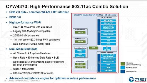 為此,Cypress特別推出了高性能嵌入式無線Combo芯片CYW4373,它可以支持802.11ac,雙頻Wi-Fi、BT 4.2,同時還支持USB和SDIO 3.0。
