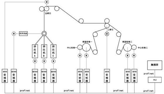 廣東某塑料機(jī)械廠的吹膜機(jī)目前采用profinet通訊,擠出與風(fēng)環(huán)風(fēng)機(jī)通過變頻器控制,牽引部分則需要控制生產(chǎn)線速度一致且動(dòng)態(tài)響應(yīng)迅速,同時(shí)要求收卷部分保持恒定的張力,薄膜不能起皺、卷取過松或過緊 ,張力量化設(shè)定,且無(wú)需人工調(diào)節(jié)。該廠商主要采用某進(jìn)口品牌的變頻器和伺服,在牽引和收卷采用伺服控制。