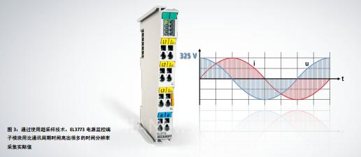 EL3773 電源監(jiān)控端子模塊能夠以極快的采樣速率采集電流和電壓的實際值,因此非常適合用于進(jìn)行高端電網(wǎng)分析并監(jiān)測三相交流供電系統(tǒng)的狀態(tài)(見圖 3)。對于每個相位,都可使用 16 位分辨率采樣最高 288 Veff/410 V DC 的電壓和 1 Aeff/1.5 A DC 的電流作為瞬時值。該款六通道端子模塊根據(jù) EtherCAT 超采樣原理以高達(dá) 100 μs 的時間分辨率同時進(jìn)行采樣,即時間分辨率比通訊周期時間高很多。